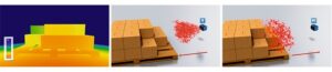 Pour chaque emplacement de pixel, le Visionary-T reçoit au moyen de la technologie de temps de vol 3D la lumière réfléchie et calcule avec l’aide du déphasage la distance entre la caméra et les objets dans la scène. Différents déphasages de la lumière correspondent à différentes distances. De cette manière, plusieurs dizaines de milliers de pixels sont enregistrés simultanément sans qu’aucune pièce physique ne bouge à l’intérieur de la caméra. Cela permet d’enregistrer des nuages de points 3D en temps réel, même pour des scènes statiques. Comme les informations de distance sont enregistrées « en une seule fois », on parle aussi de technologie d’instantanéité 3D – le chariot élévateur peut « voir ».